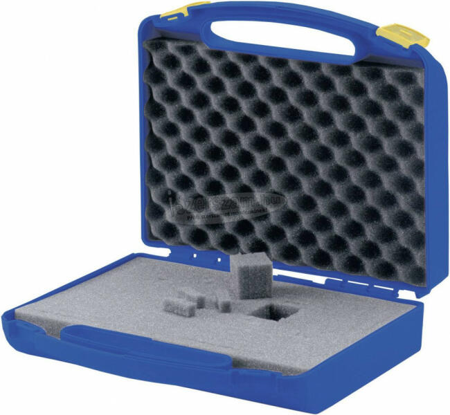 Műanyag koffer hullámos habszivacs betéttel A hullámos habszivacs betét érzékeny tárgyak megóvására szolgál. A betét éles késsel kivágható a kívánt formára. A koffer színe kék, sárga zárakkal. Műszaki adatok: Belső méret magasság: 185 mm · Belső méret mélység: 76 mm · Belső méret szélesség: 270 mm · Méret, magasság: 250 mm · Méret, mélység: 85 mm · Mé