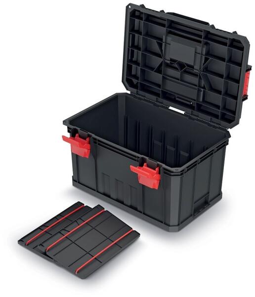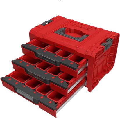 Doboz fiókokkal a PRO sorozatból, az összes rakodási lehetőséggel. A speciális RED HD színű bevonat még nagyobb ütésállóságot és a fagypont alatti hőmérsékleten való ridegséggel szembeni ellenállást biztosít. Poliamid kettős csatlakozók más PRO sorozatú modulok csatlakoztatásához megerősített szerkezet három alacsony fiók tárolókkal és állítható elválasztó