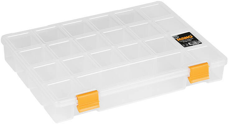Kivehető rekeszek ideálisak kisebb tárgyak tárolására. Törhetetlen átlátszó tok fedele. A praktikus fogantyú kényelmes szállítást biztosít.