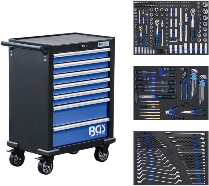 BGS Technic - Germany 263 darabos szerszámkészlettel felszerelt BGS kék-fekete szerszámos kocsi 7 db fiókkal Jellemzők: - 2 db fix + 2 db forgós (1 db fékes) golyóscsapágyazott görgős gumis kerekekkel. - A kerekek olaj és egyéb folyadék állóak. - 7 gördülékeny futású golyóscsapágyas fiók - Fiókok: 1 - 5 kapacitás: egyenként 20 kg 6 - 7 fiók kapacitás: egyenként 30 kg