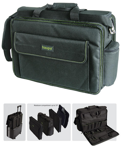 Haupa 220292 Szervíztáska "Supply" Haupa szervíztáska „Supply Dokumentumtároló zseb, bedugós helyek szerszámok és mérőműszerek részére, zseb apró alkatrészek számára, nagy bedugós rekeszek, gumiszalagos elválasztás, elkülönített főrekesz (kipárnázott) laptop és dokumentumok számára, kivehető középső falának köszönhetően felosztható. Notebookzseb 15 formátu
