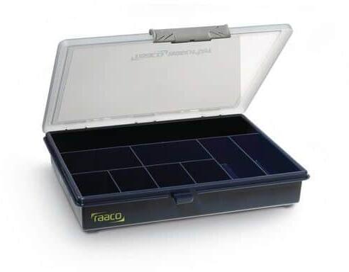 Zárható műanyag rendszerező kis szerszámok és anyagok tárolására. Átlátszó fedél a tartalom gyors áttekintéséhez. Fix rekeszek.