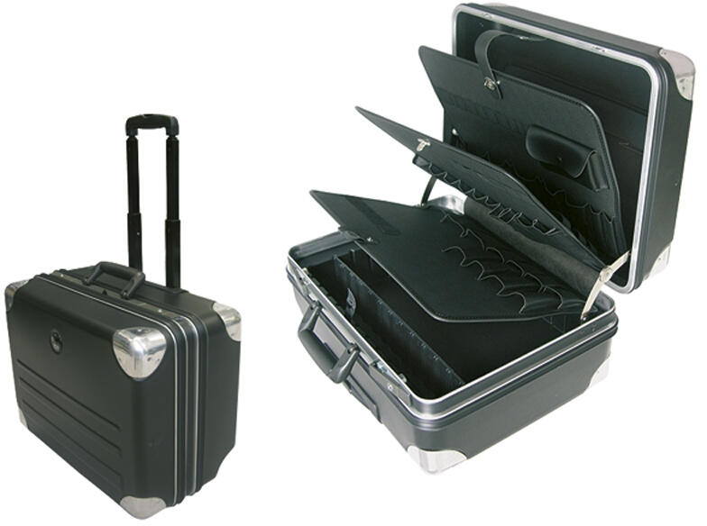 Haupa 220248 Szerszámkoffer- Trolley "Fly" ütésvédő léccel, üres kivitel Haupa szerszámkoffer "Fly" Kemény koffer, ABS műanyagból, fekete, HDPE masszív anyagból, extrém erős, robosztusz, 3 szerszámtábla, számzárral, dokumentációk részére zsebbel, padlórész variálható válaszfalakkal, hord szíjjal. Repüléshez használható és törésbiztos. Extrém terhelhetőség a H