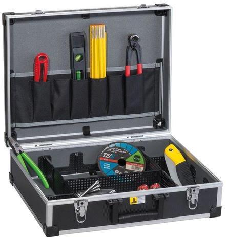 Ellenálló műanyag koffer alumínium kerettel. Elsősorban szerszámokra és szerelőanyagokra. Alakítható műanyag rekeszek és textil zsebek a koffer felső részében. Fémkapcsok segítségével zárható. méretek ma x szé x mé: 145 x 445 x 335 mm anyaga: műanyag/alumínium színe: fekete tömege: 2,5 kg