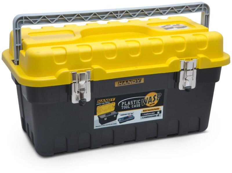 Műanyag szerszámtároló láda fém csattal, belső rendszerezővel és véletlen kinyitásgátlóval. (ha nincs zárva a csat és megemelik a táskát az nem nyílik ki) A képen látható csavarok, szerszámok illusztrációk, nem a tartozékai a táskának. Mérete: 458 x 247 x 233 mm Anyaga: Műanyag Tálca tulajdonságai: 1 nagy, 2 közepes, 5 kicsi tároló Szín: Sárga - fekete