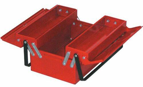 Acél szerszámkoffer három rekesszel. Egy nagy rekeszből és két polcból áll. A kétrészes felső rész külön zárja a felső polcokat. Két rugalmas fogantyúval a könnyű áthelyezésért.
