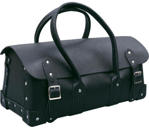 Kruponbőrből készült táska, körbefutó bőr hordozófülekkel Bőrből készült zárószíjak fém csattal Szegecselt kivitel, sarok megerősítésekkel Fekete színű.