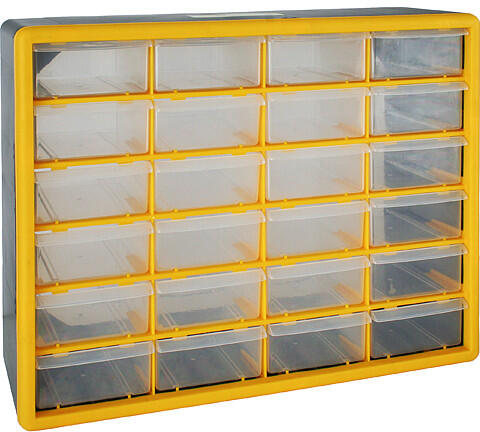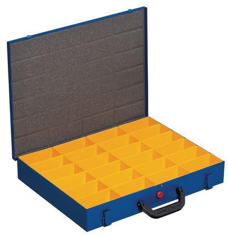 Műanyag tároló az apróbb anyagok huszonnégy állítható rekeszben történő tárolására. Átlátszó fedél a könnyebb tájékozódás és a tartalom ellenőrzése érdekében. Műanyag kapcsokkal zárható. A stabil fogantyúnak köszönhetően könnyen mozgatható.