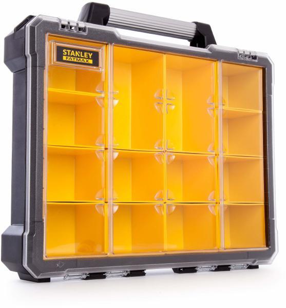 Stanley FATMAX Profi szortimenter Átlát szó polycarbonate fedél, mely sokkal átláthatóbbá teszi a szortimentert Az erős, rozsdamentes csatok megkönnyítik a szállítást és növelik az élettartamot Alumínium, nagyméretű fogantyú 14 tálca, változtatható elhelyezéssel Vállra akasztható szíj a praktikus szállítás érdekében A stabilan zárható fedélrész biztosítja,