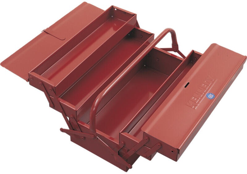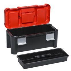 Szerszámos kuffer ellenálló műanyagból kivehető tálcával és rekesszel. Két rögzített és egy kivehető zárható fogyóeszköz rendszerező a láda fedelében. Alumínium klipsszel és fogantyúval, csúszásgátló talppal.
