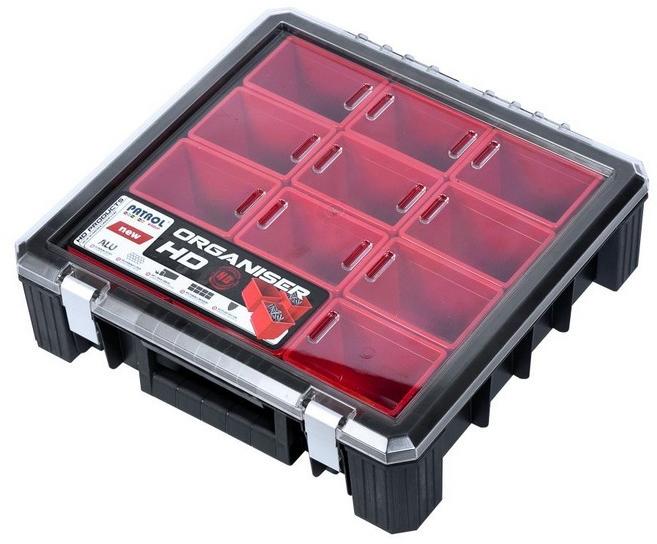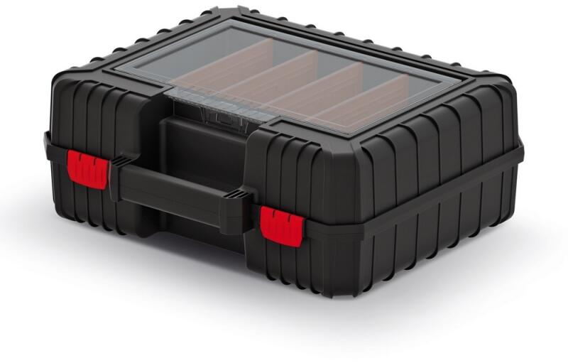 Ez az egyszerű szerszámtáska minden ezermesternek vagy ezermesternek jól jön. A szerkezet edzett műanyagból készült, amely mechanikai ellenállást biztosít a doboznak. A tok fedelében egy robusztus polikarbonát tetővel beépített válaszfal-rendező található a kisebb edények és alkatrészek áttekinthető tárolására .