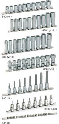 Dugókulcs készlet 10 mm-es (3/8") Jellemzők: Külsőnégyszögű meghajtás 10 = (3/8″) · Egyszerű szerelés: 2 furat pl. falra való rögzítéshez. · A meghajtás méretének megfelelő tartókapcsok · Áttekinthető, gyorsan hozzáférhető elrendezés · Fémből készült, üres, 16 tartókapoccsal — 880-as dugókulcs betétek elhelyezéséhez Műszaki adatok: Méret, hossz: 430 mm