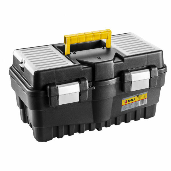 Topex 19"-os szerszámosláda (kat. sz. 79R132), mérete 46.2 x 25.6 x 24.2 cm. masszív, praktikus szerszámosláda strapabíró műanyagból, alumínium zárral. A szerszámosládában két rendeződobozzal az apró elemek tárolásához, belső tálcával és kényelmes hordfogantyúval. Kézreállók az oldalfogantyúk is. A Topex márka ezermestereknek készül. 19" Szerszámosláda, rendező