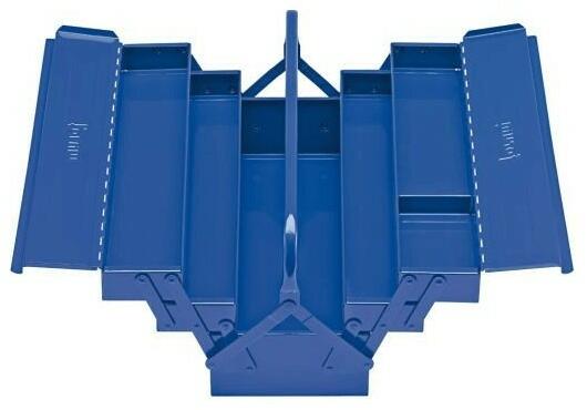 Ötrészes szerszámosláda lehajtható fogantyúval. A fogantyú felhúzásával a rekeszek összezáródnak lakattal zárható (nem tartozék) anyaga: acéllemez