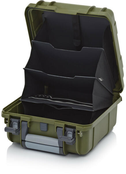 Magas minõségű műanyag Összeillesztett választó rekeszek a belsõ bevágásokban, amelyek megakadályozzák a benne tárolt szerszámok elcsúszását Fogantyú a szállításhoz, erõs zárszerkezettel Használata ajánlott úgy műhelyekben, mint otthon, kisebb és nagyobb szerszámok tárolására egyaránt