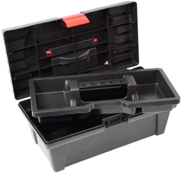 Hobby szerszám tároló láda - 380 x 295 x 160 mm Belsejében 1 nagy rekesz + 4 kisebb fix rekesz A tetején külön álló, kivehető 4 fix rekeszes tároló, transzparens tetővel A láda dupla műanyag csattal záródik Méret:380 x 295 x 160 mm