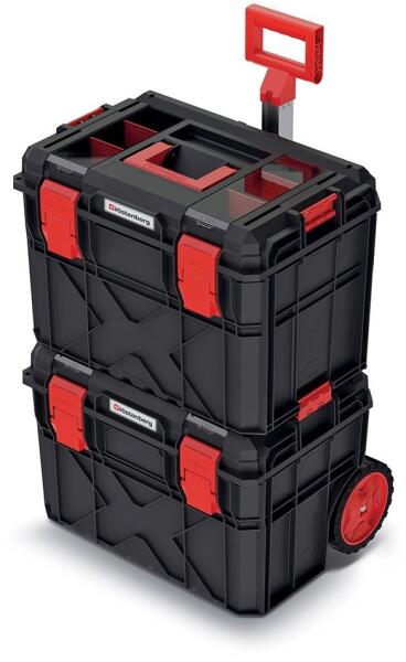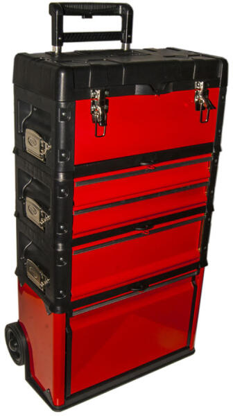 4 részes szerszámos láda kihúzható hordozó füllel (320mm) mely 3 pontban fixálható, valamint 2 kerékkel (O120x30mm). A 4 tároló doboz külön-külön is használható, vagy egymással kombinálható. Mindegyik rekesz lakattal zárható (a lakat nem tartozék!) 1. rész: Csatos tárolórekesz kivehető szerszámtartó tálcával. A tálca szélén mm skála található (0-400mm). 2. ré
