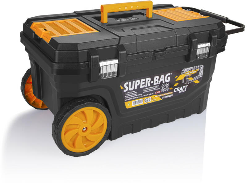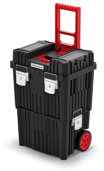 Masszív szerszámosláda békazárral, fém zsanérral ellátva, amely ideális többféle szerszám biztonságos tárolására! Könnyű hordozhatóság a kerekeknek köszönhetően, strapabíró külső borítás. Súlya: 4,8 kg