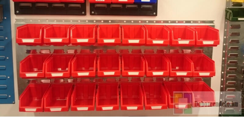 Nagy teherbírású réselt, fém lemez, hátoldalán két függőleges merevítéssel, BULL2 Piros dobozokkal.