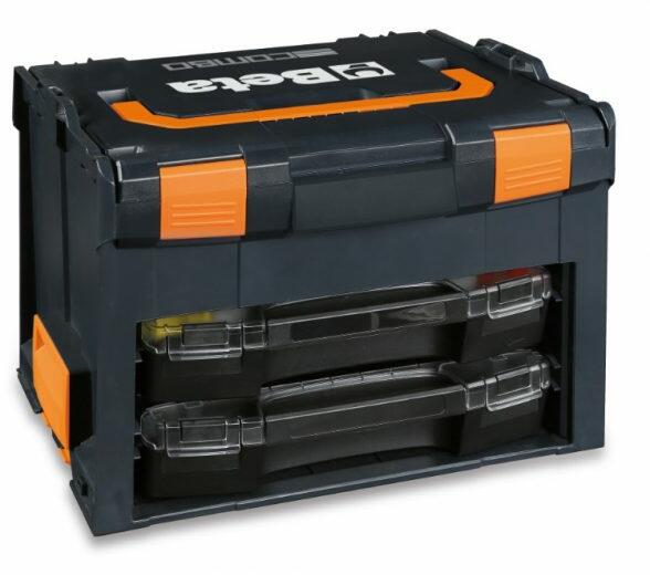 BETA C99V3/2C-ABS SZERSZÁMTÁSKA, 2 HORDOZHATÓ A szerszámdobozok egyszerűen összekapcsolhatók egy kattintással, a praktikus oldalsó bepattintós mechanizmus segítségével. A szerszámdobozok tetszőlegesen variálhatók a felhasználó igénye szerint. Főbb jellemzői: Külső méretek: 445x358x322 mm 2 darab C99C-V3 üres rendezőtálca Max. belső teherbírás: 25 kg Súly: 5,6 kg