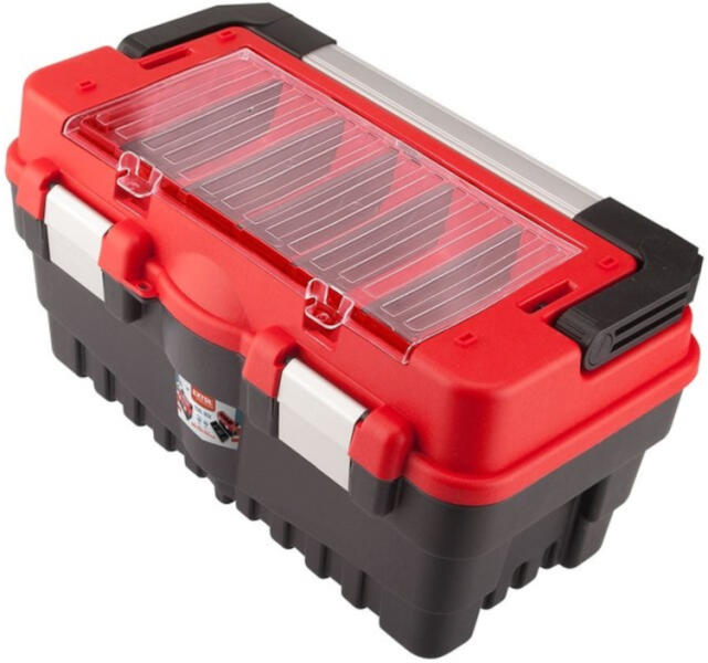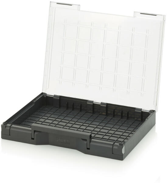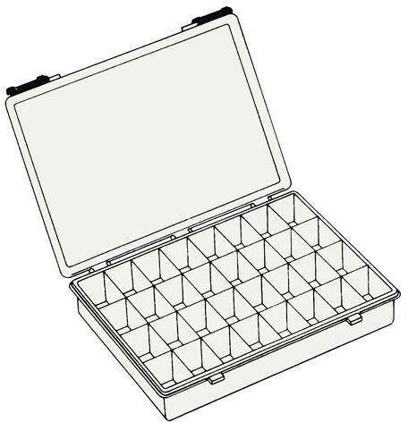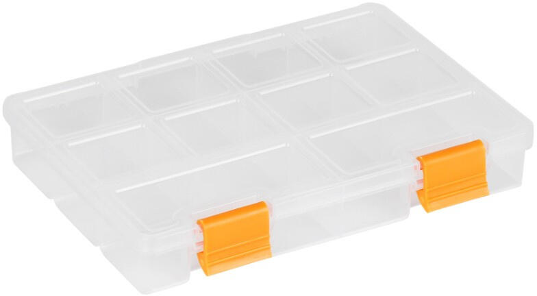 Zárható műanyag rendszerező kis szerszámok és anyagok tárolására. Átlátszó fedél a tartalom gyors áttekintéséhez. Fix rekeszek.