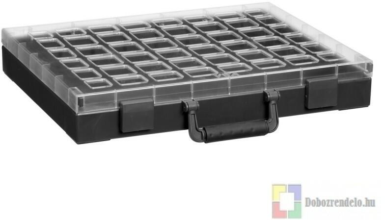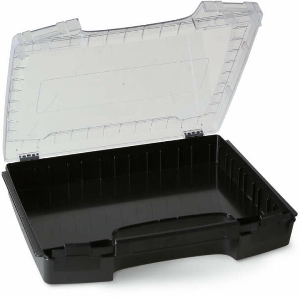 Hordozható szerszámosláda, üresAz átlátszó fedélnek köszönhetően könnyen felismerhető a tartalma Beépített fogantyú Külső méret: 367x316x72 mm Súly: 0,9 kg Lehetséges belső kialakítás: 7 rekesz C99T-V3 hőformált tálca 17 darab C99P-V3 tálca
