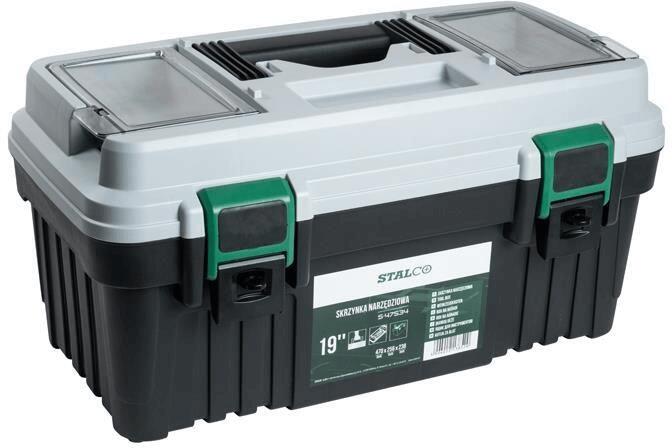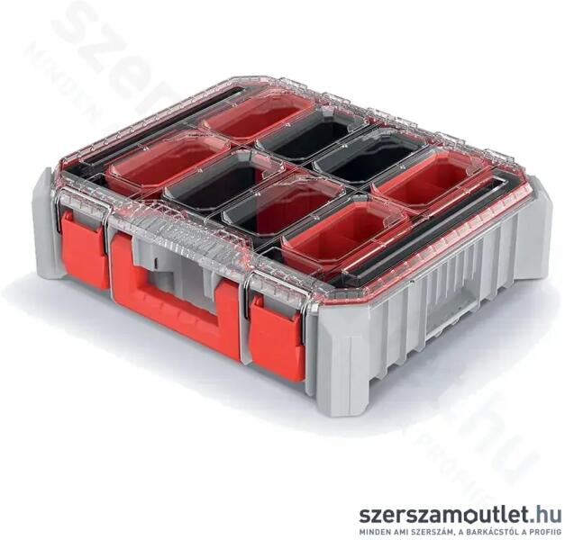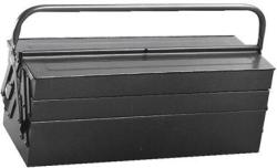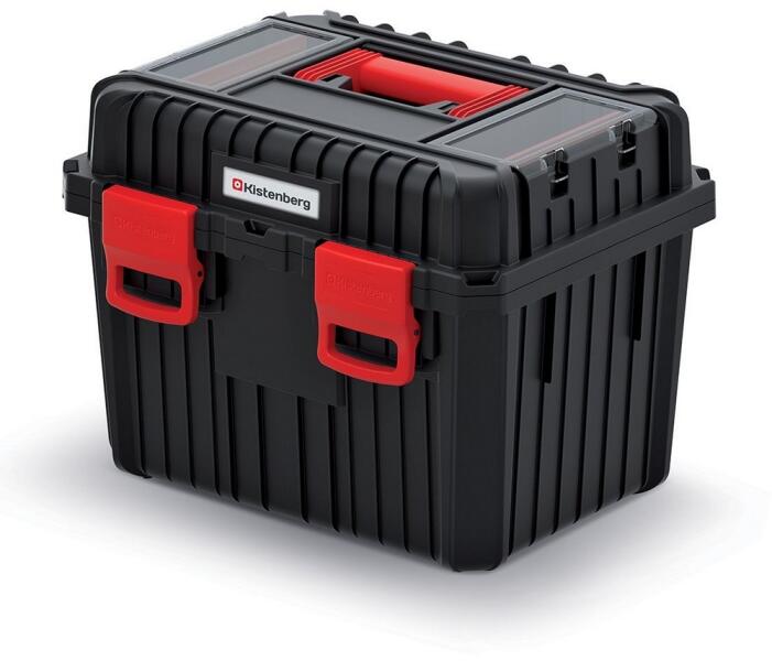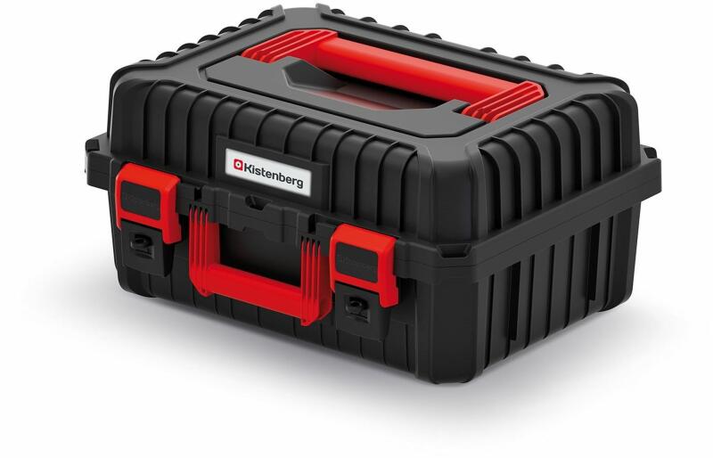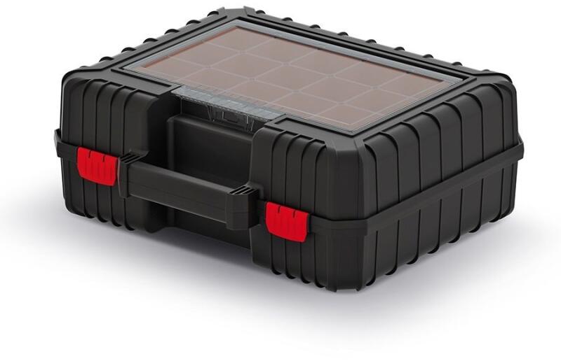 Ez az egyszerű szerszámtáska minden ezermesternek vagy ezermesternek jól jön. A konstrukció edzett műanyagból készült, amely mechanikai ellenállást biztosít a doboznak. A tok fedelében egy robusztus polikarbonát tetővel beépített dobozrendező található a kisebb szerszámok és alkatrészek áttekinthető tárolására.