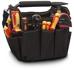 "" A termék leírása: Rendkívül praktikus, külső oldalain és belsejében sok különböző méretű zsebbel ellátott szerszámtartó táska. Erős fém fogantyúval rendelkezik, amely középen habszivaccsal burkolt a kényelmes fogás érdekében. A tartozék vállpánt segítségével könnyedén hordozhatja szerszámait (a vállpánt és a fém fogó szükség esetén egyaránt levehet