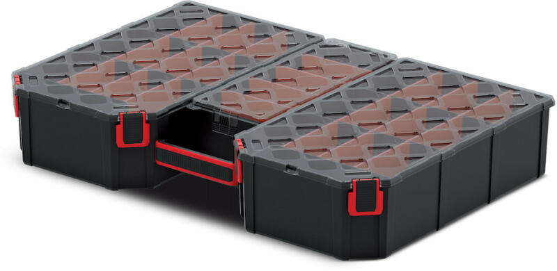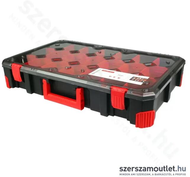 TAGER többfunkciós szervező: – A test fokozott szilárdságú polimerek keverékéből készült. – Ergonomikus fogantyú. – Átlátszó fedél. – Funkcionális partíciók. – Tartós rögzítőelemek.