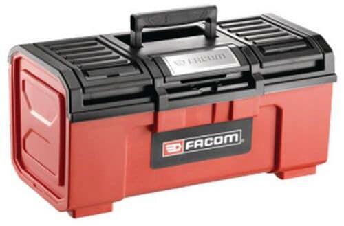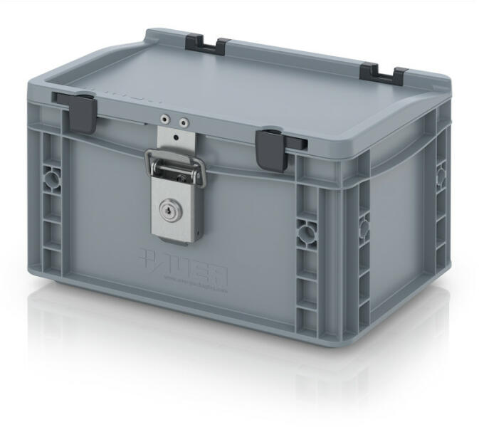 Egymásra rakható műanyag szerszámos láda. Fedő egy kézzel nyílik és magától záródik. Tartós fémrögzítés, lakattal zárható (a zár nem tartozék). 2 tárolórekesz a fedélben. Behúzható fogantyú.