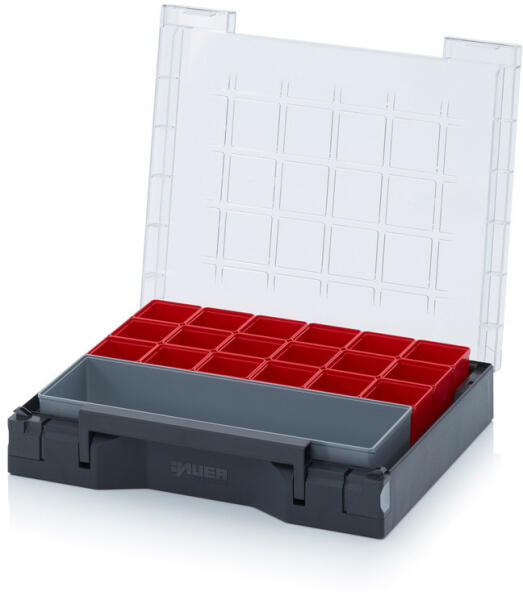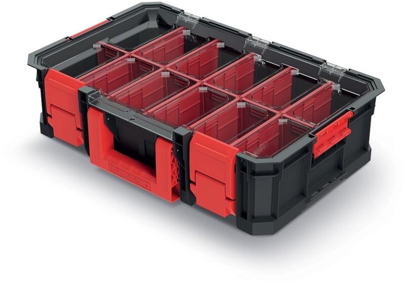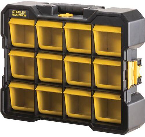 Fatmax rendszerező 12 csuklós és kivehető tartállyal. A tárolókapacitás növelése érdekében a szervezők kombinálhatók. Praktikus ergonomikus fogantyú a hordozáshoz. Minden rekesz átlátszó, tartós polikarbonát fedéllel rendelkezik.