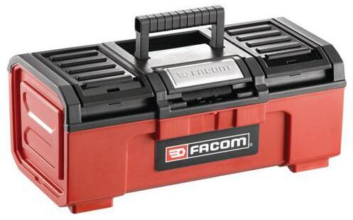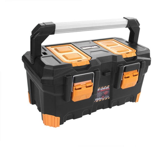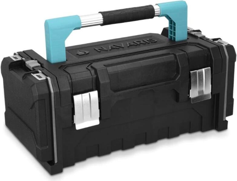 Egymásra rakható műanyag szerszámos láda. Fedő egy kézzel nyílik és magától záródik. Tartós fémrögzítés, lakattal zárható (a zár nem tartozék). 2 tárolórekesz a fedélben. Behúzható fogantyú.