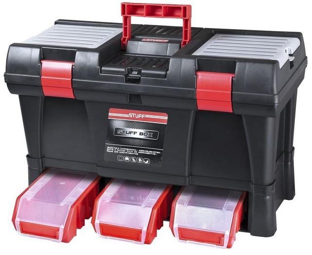 Szerszámos kofferek ellenálló műanyagból kivehető, zárható boxokkal és fedett felső rekeszekkel. Belső kivehető tál rekeszekkel a kisebb szerszámokra. Műanyag vagy alumínium klipszek és függőlakattal való lezárási lehetőség. méretek ma x szé x mé: 325 x 256 x 325 mmanyaga: műanyag, alumíniumszíne: fekete/piros (boxok)tömege: 2,864 kg