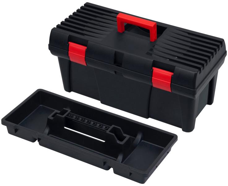 Fekete színű, műanyag szerszámosláda 20"-os tálcával és fémcsatokkal. Lehetővé teszi a szerszámok helytakarékos és rendezett tárolását. Mérete: 51 cm x 26 cm x 23 cm.