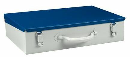 Fém szerszámkoffer elektromos szerszámok tárolására. Ellenálló lemezből készül. Fogantyúval rendelkezik a kényelmes tartásért. Két kapoccsal zárható.
