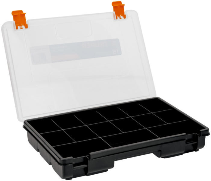 Főbb jellemzők: Hagyományos kialakítás Műanyag szortimenter 15 rekeszes Átlátszó tető HordozófülHosszúság 280 mmMagasság 40 mmSzélesség 190 mm