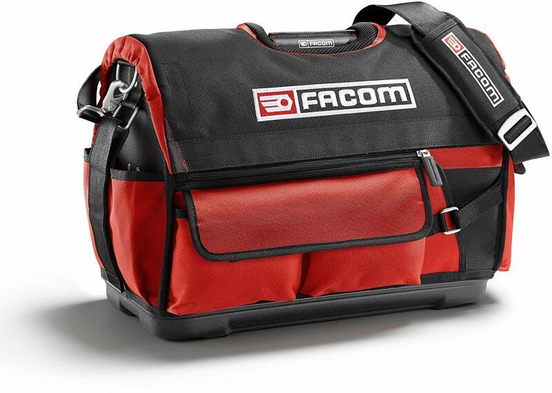 FACOM szerszámtáska, PRObag Jellemzők: Számos zseb, robosztus kialakítás, vízálló Rendkívül ellenálló, nagy erősségű poliészter anyag 1200 x 1200 den Merev és vízálló polietilén fedél Alumínium fogantyú Párnázott vállpánt Függőleges tárolóhely a szerszámok azonnali eléréséhez Rugalmas szerszámtartó heveder Oldalsó tároló a csavarhúzóknak és kiütő tüs