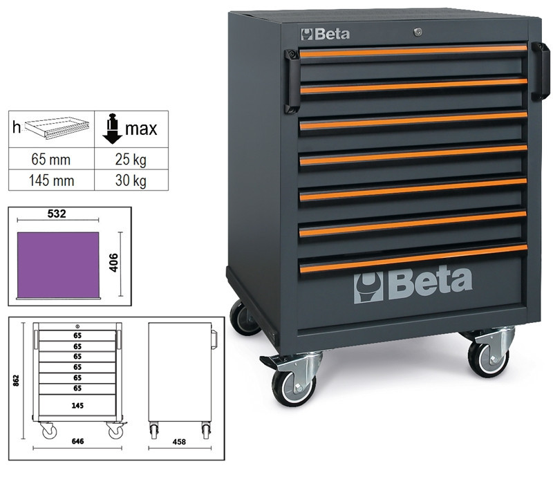 7 fiókos szerszámkocsi a C45PRO műhelyberendezés összeállításhoz • 7 db teleszkópos, csapágyazott fiók (532 mm x 406 mm) • 4 db forgókerék Ø 100 mm (egy fékezhető) • A fiókok habgumival béleltek • Központi zár elöl • Függőlegesen állítható talp • Hőformált tálcák elhelyezhetők • Keretbe épített fogantyúk a könnyebb kezelésért