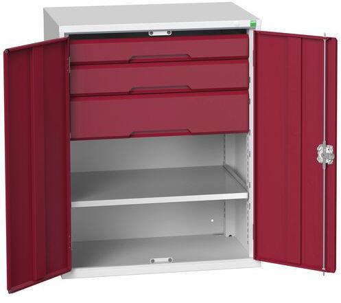 Polcokkal és fiókokkal felszerelt fém műhelyszekrények a hatékony működéshez és műhelyekhez. Hegesztett acélszerkezet, porszórt felületkezelés. Megerősített lengőajtók hárompontos hengeres középső zárral, két kulccsal. Horganyzott polcok 75 teherbírással kg, 25 mm-es rácsban állítható magasság. 75 kg-os teherbírású fiókok, görgős csapágyakon 100%-os kihúzás