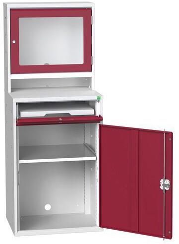 Számítógépes szekrény, amely alkalmas PC-eszközök biztonságos munkahelyi tárolására és használatára. Hegesztett acélszerkezet, porszórt felületkezelés. Külön zárható szellőző rekesz a monitorhoz kilátó ablakkal. Zárható alsó szekrény kábelhüvelyekkel. Zárható fiók billentyűzet és egér. 1 állítható magasságú horganyzott polc.