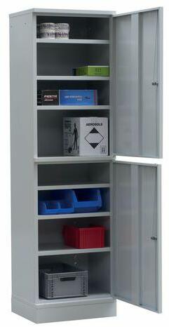 Fém műhelyszekrények polcokkal 100 kg teherbírással. Megerősített szárnyas ajtók perforált belső oldallal a szerszámok tárolására. Magas hegesztett acélszerkezet 1,5 tonna teherbírással, porszórt felülettel. Zárás központi zárral hengerzár két kulccsal. . 25 mm-es lépésekben állítható magasságú horganyzott polcok.