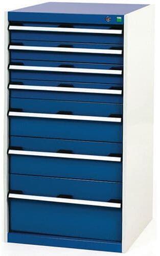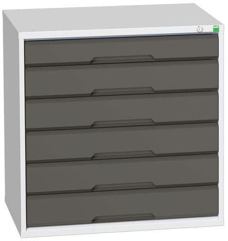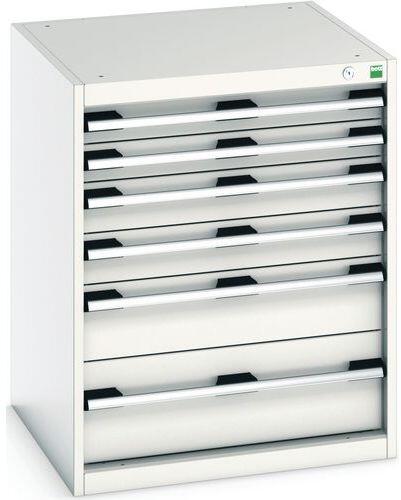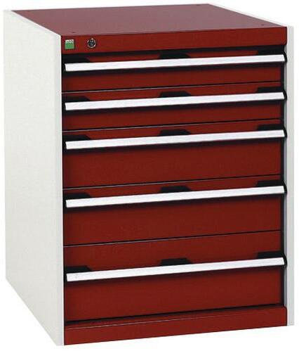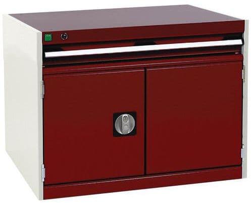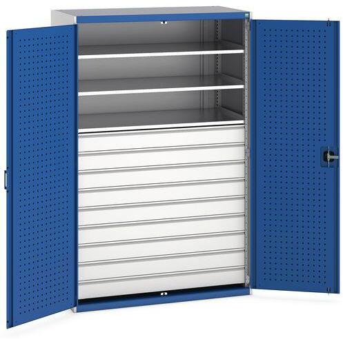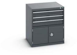 Bott Cubio fiókos szekrények 75 kg-os teherbírású és 100%-os görgőscsapágyakkal bővíthető fiókokkal. Szekrényajtó perforált belső oldallal a szerszámok tárolására. Magas hegesztett acél konstrukció akár 1,5 tonna teherbírással, porszórt bevonattal befejezni. Központi zárrendszerű zár és egyidejűleg több fiók nyitásának blokkolása. Ergonomikus fogantyúk írhat