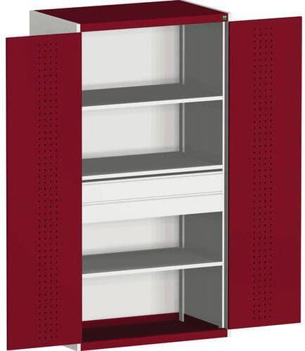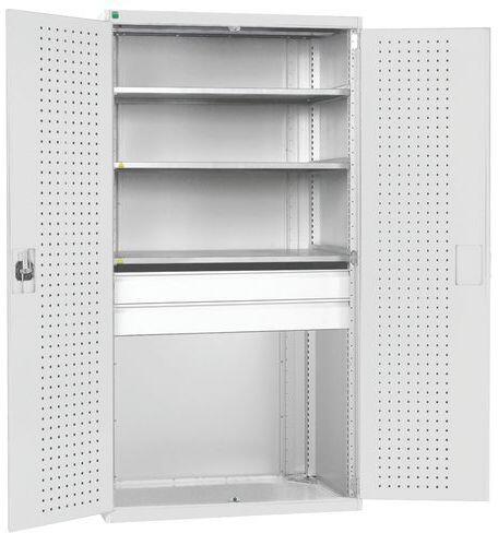 160 kg teherbírású polcokkal és fiókokkal felszerelt fém műhelyszekrények a hatékony üzemi és műhelyi felhasználás érdekében. Magas hegesztett acélszerkezet 1,5 tonna teherbírásig, porszórt bevonattal. Megerősített szárnyas ajtók perforált belső oldallal szerszámok tárolására. . Hárompontos hengeres tengelytávzár két kulccsal. 25 mm-es lépésekben állítható ma