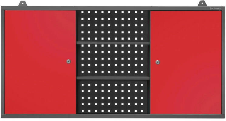 JAN NOWAK BEN függő garázsszekrény, 1200 x 600 x 200 mm, antracit-piros A keskeny, falra akasztható szekrény nem korlátozza a parkolóhelyet a garázsban, és akadálytalan átjárást biztosít. Praktikus rekeszelosztással, kiegészítő polcokkal és hátul elhelyezett szerszámtáblával rendelkezik. A felsorolt szempontok azt jelentik, hogy több tárgy fér el benne, és ezek rendszer