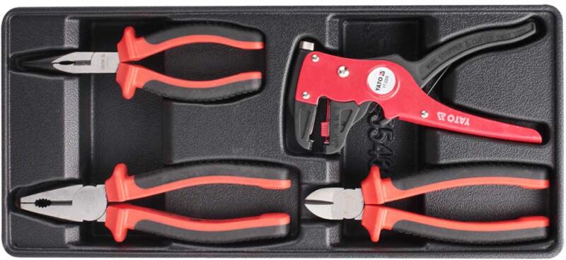 Szerszámoskocsi fiók 4db szigetelt fogó műanyag fiókbetét - szigetelt hosszúcsõrű fogó YT-2104 160 mm - szigetelt kombinált fogó YT-2102 180mm - szigetelt oldalcsípõ fogó YT-2109 160mm - szigetlet blankoló fogó YT-2268 1000V EAN: 5906083554643