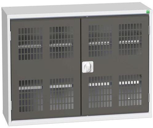 Fém műhelyszekrények drótajtókkal a jó szellőzés és a tartalom átláthatósága érdekében. A 75 kg teherbírású horganyzott polcok magassága 25 mm-es lépésekben állítható. Hegesztett acélszerkezet, porszórt felületkezelés. Hárompontos zárás hengereltolásos zár.