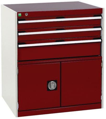Bott Cubio fiókos szekrények 75 kg-os teherbírású és 100%-os görgőscsapágyakkal bővíthető fiókokkal. Szekrényajtó perforált belső oldallal a szerszámok tárolására. Magas hegesztett acél konstrukció akár 1,5 tonna teherbírással, porszórt bevonattal befejezni. Központi zárrendszerű zár és egyidejűleg több fiók nyitásának blokkolása. Ergonomikus fogantyúk írhat
