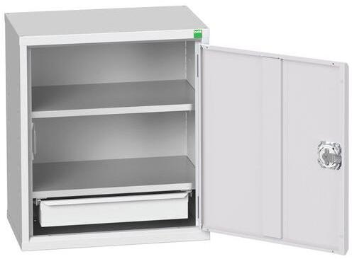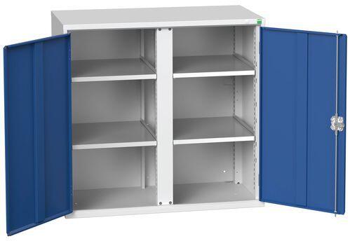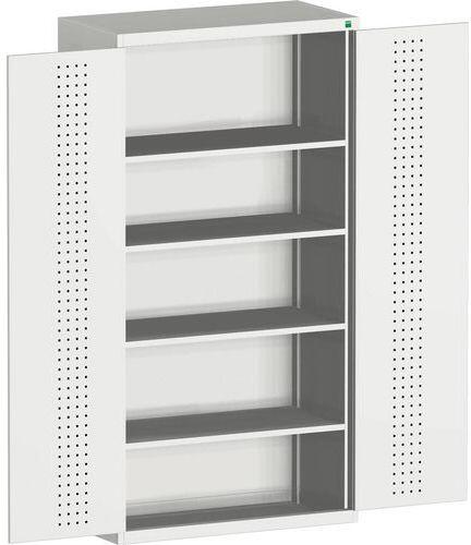 Fém műhelyszekrények polcokkal 100 kg teherbírással. Megerősített szárnyas ajtók perforált belső oldallal a szerszámok tárolására. Magas hegesztett acélszerkezet 1,5 tonna teherbírással, porszórt felülettel. Zárás központi zárral hengerzár két kulccsal. . 25 mm-es lépésekben állítható magasságú horganyzott polcok.