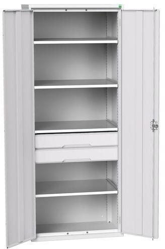Polcokkal és fiókokkal felszerelt fém műhelyszekrények a hatékony működéshez és műhelyekhez. Hegesztett acélszerkezet, porszórt felületkezelés. Megerősített lengőajtók hárompontos hengeres középső zárral, két kulccsal. Horganyzott polcok 75 teherbírással kg, 25 mm-es rácsban állítható magasság. 75 kg-os teherbírású fiókok, görgős csapágyakon 100%-os kihúzás