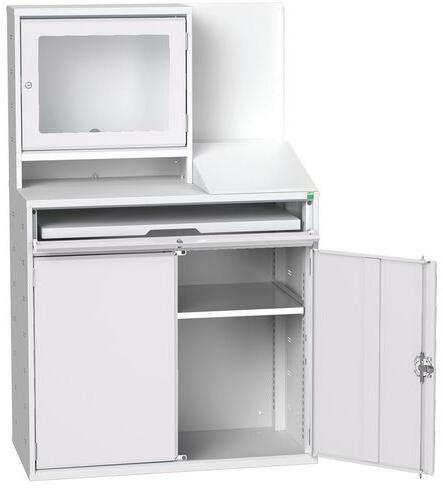 Számítógépes szekrény alkalmas PC-eszközök biztonságos munkahelyi tárolására és használatára. Hegesztett acélszerkezet, porszórt felületkezelés. A munkát megkönnyíti a ferde íróasztal és a hátsó mágneses panel. Külön zárható rekesz a monitornak, szellőzővel ablak. Zárható alsó szekrény kábelhüvelyekkel. Zárható fiók billentyűzet és egér számára. 1 ál